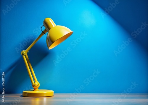 Wide-Angle Photo: Yellow Desk Lamp, Blue Wall - Interior Design, Home Office, Lighting, Minimalist