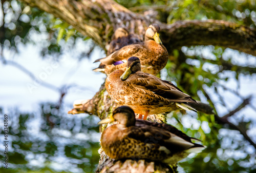 Wild ducks sit on a tree near the water