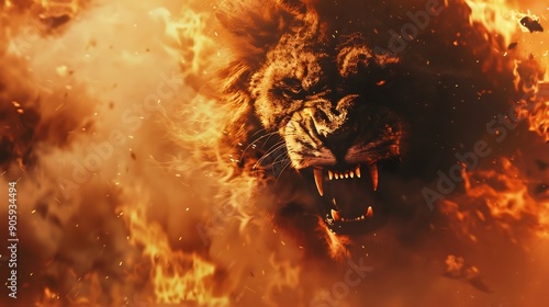 Wild fire lions cause chaos and destruction against the backdrop of fire.