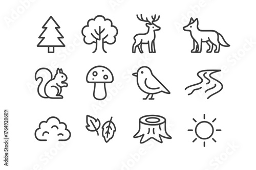 Wild Forest Icons. Wild forest. Line icon set of wild forest: pine tree, oak tree, deer, fox, squirrel, mushroom, bird, river, bush, fallen leaves, tree stump,