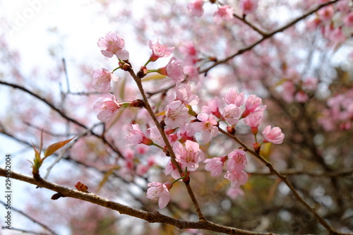 Wild Himalayan Cherry at Nan, North of Thailand. Prunus cerasoides. Blossom of pink king tiger flowers or thai cherry blossom (Thai Sakura). Selected focus