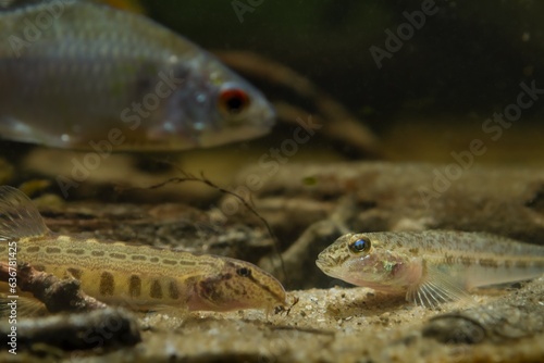 wild monkey goby on sand bottom, dangerous species of dwarf freshwater fish, Southern Bug river endemic, biotope aquarium, blurred figure of spined loach and bitterling, low light mood, shallow dof