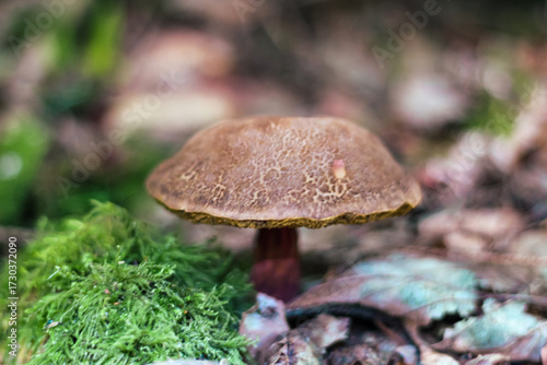 Wild Mushroom Growing Among Moss and Leaves