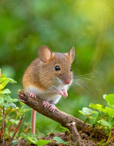 Wild Wood mouse resting on a stick on the forest floor with lush green vegetation