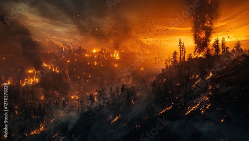 Wildfire devastation, burning forest, city engulfed in flames