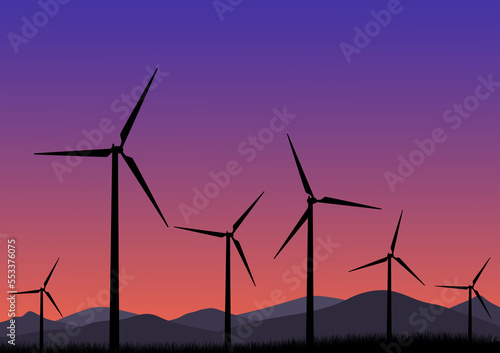 Wind turbines in the sunset vector illustration