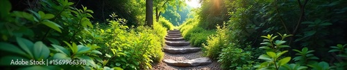 Winding Mountain Path A Sun-Dappled Trek Through Lush Foliage, Inviting Exploration and Adventure