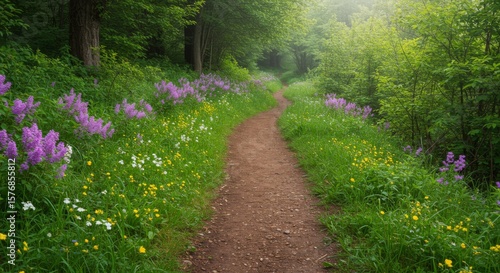 Winding Path Through a Sunlit Forest with Purple and Yellow Wildflowers