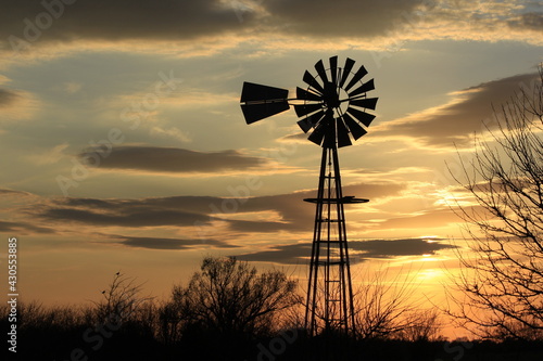 windmill at sunset with clouds and tree's north of Hutchinson Kansas USA out in the country.