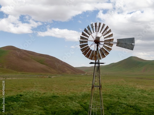 Windmill for waterwell on ranch land. Hills are covered with yellow flowers. Lost Hills, California, United States of America.