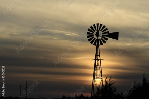 Windmill out in the country at Sunset with a colorful sky west of Nickerson Kansas USA .