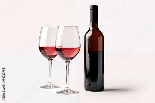 Wine bottle with glass on white background. Wine related themes. Wine professions. Onologist. Wine shop. Buying and selling wine. Images for graphic designers. Isolated wine. Image for website.