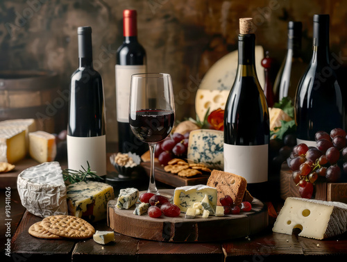 Wine bottles and wine glasses on the table and a cheese platter. AI generative.