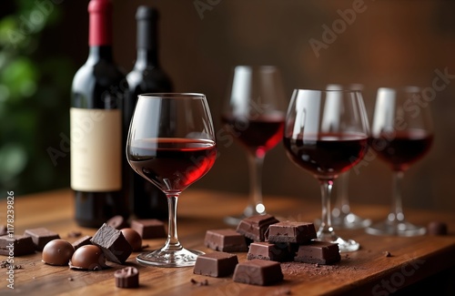 Wine, chocolate tasting experience. Various wines, chocolates presented on wooden table. Expert wine, chocolate pairing experience. Luxury indulgence. Connoisseur lifestyle. Great for gourmet gift.