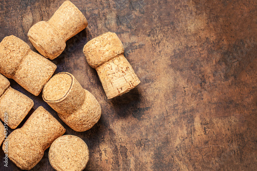 Wine corks on a wooden table. Wine, festive concept. Top view. Flat lay.