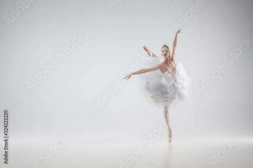 Winter alive. Young graceful classic ballerina dancing on white studio background. Woman in tender clothes like a white swan. The grace, artist, movement, action and motion concept. Looks weightless.