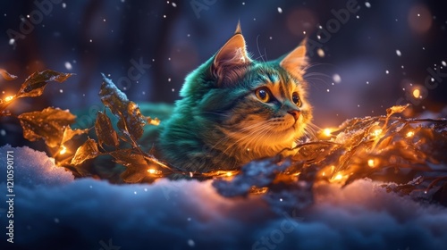 Winter elegance with a cat amidst a snowy forest. Generative AI