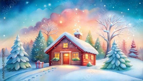 Winter fairy tale house in the forest with snow and Christmas decorations at sunset