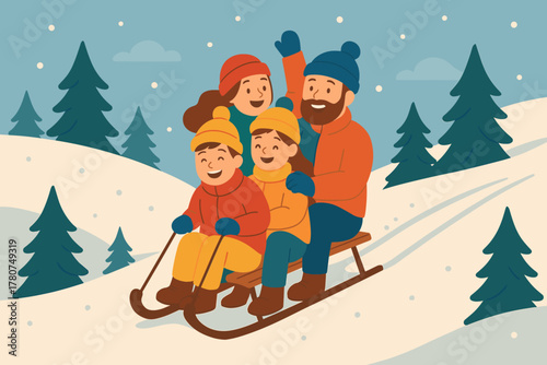 Winter family illustration ,snow, holidays, fun, mountains, children