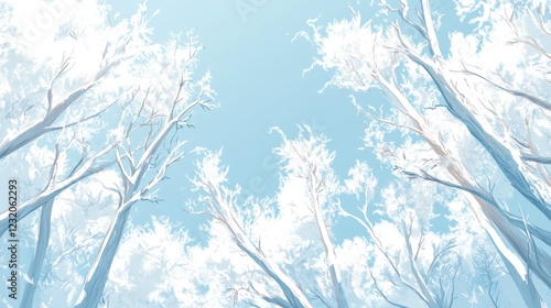 Winter forest, snow-covered trees, blue sky, tranquil scene, nature background