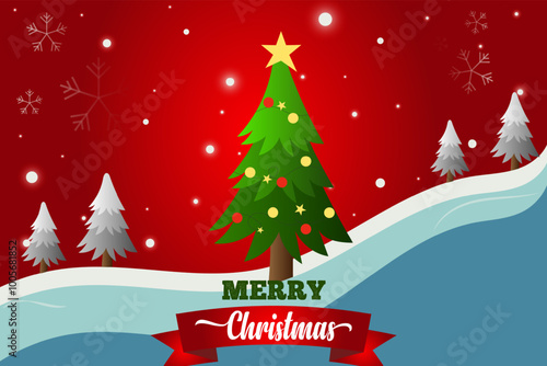 Winter holiday Merry Christmas and advanced new year greetings vector template, poster with eye catching christmas trees, snowflakes and gradient background red color combination