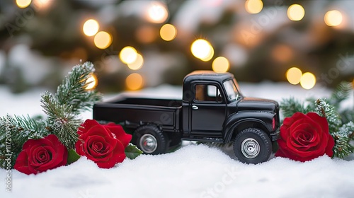 Winter holiday setup with a black toy truck, colorful roses, and snowy fir branches. Romantic red theme and blurred lights.