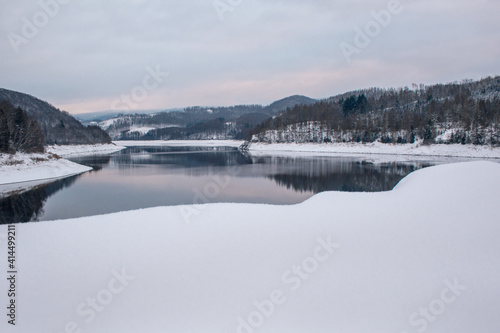 Winter landscape at Soesetalsperre in Harz Mountains National Park, Germany. Moody snow scenery in Germany