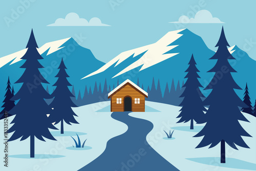 Winter landscape with snowy mountains, pine trees, house, and a winding path