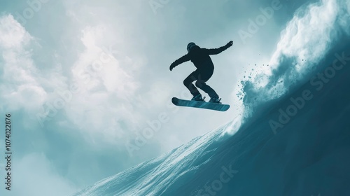 Winter Mountain Snowboarding In Blue And White Landscape Cold Fresh Air Extreme Action Athlete Jumping In The Sky Dynamic Lifestyle