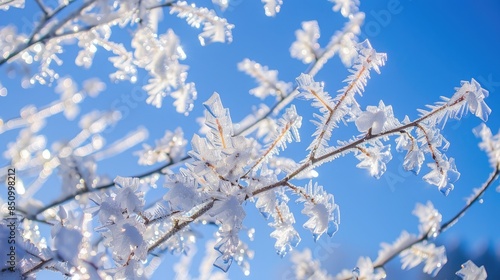 Winter Nature Close up of Rime Ice on Tree with Blue Sky Background