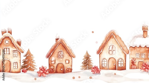 Winter scene with three gingerbread houses, snow-covered rooftops, pine trees, and decorative floral elements on a white background Copy Space