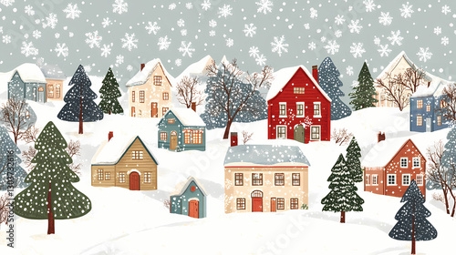 Winter village scene with houses, trees, and snowflakes, christmas, charming and nostalgic pattern. Memory - Old house. Illustration