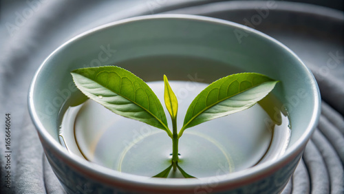 Winter wellness retreat for relaxation and healing. A sprouting plant emerges from water in a serene bowl, symbolizing growth and renewal.