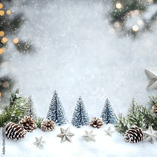 Winter Wonderland: Festive Snow Scene with Pine Cones, Stars, and Snowy Trees