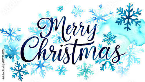 Winter Wonderland Watercolor Background with Snowflakes and Merry Christmas Calligraphy, Elegant and Luxurious Christmas Design. Blue Watercolor with Snowflakes. 1