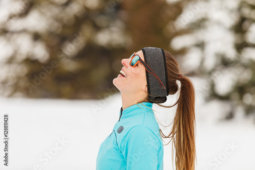 Winter workout. Girl wearing sportswear and sunglasses.