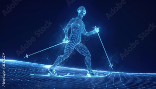Wireframe depiction of a skier demonstrating cross country skiing technique on a blue background