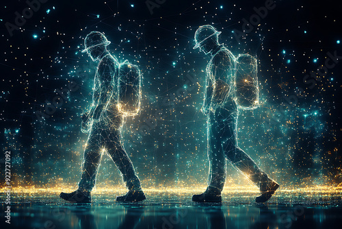 Wireframe silhouettes of workers formed by geometric lines and glowing dots, creating a modern and tech-inspired visual.