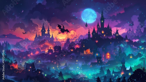 Witch flying on a broomstick over a village with decorated houses cartoon Vector Illustration