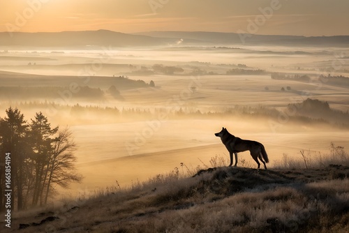 Wolf on a hilltop overlooking a misty valley at sunrise