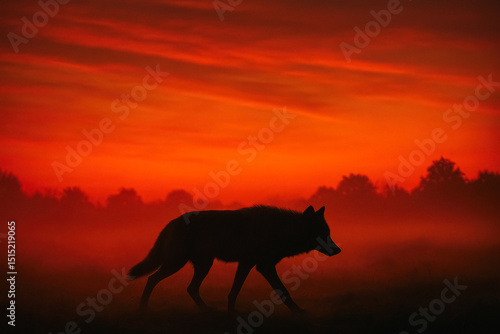 Wolf silhouette walking in misty field at red dawn, wild freedom and mystery, generative AI