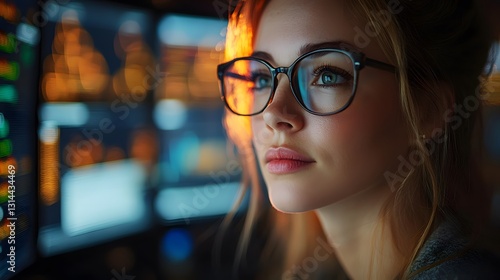 Woman analyzing financial data on multiple screens, stock market charts, high-tech office, professional business leader