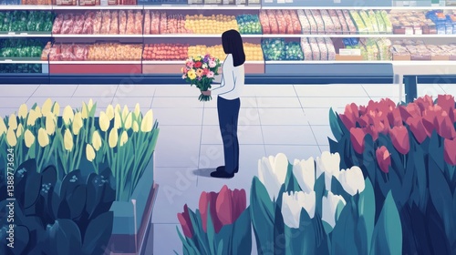 Woman Buying Flower Bouquet in Grocery Store Offering Colorful Selections