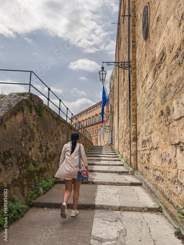 Woman climbing a rustic stone stairway flanked by historical brick walls in a charming Italian town. A peaceful and scenic moment with natural textures and warm tones under a partly cloudy sky.