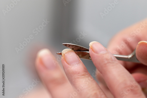 Woman cutting her finger nails with a metal nail scissors