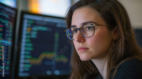 Woman Data Scientist Analyzing Statistical Charts and Graphs in a Modern Office Setting with Focus on Data Analysis Techniques and Tools