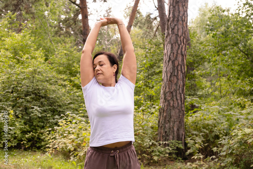Woman doing stretching exercises on mat in the park. Fitness and wellness. Outdoor exercise. Healthy lifestyle.
