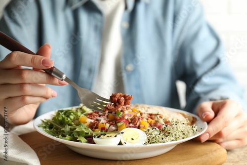 Woman eating delicious salad with brown rice at wooden table, closeup