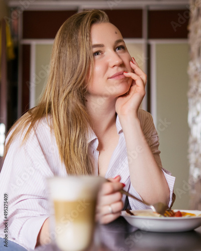 Woman eating her breakfast and drinking coffee while sitting at the table.