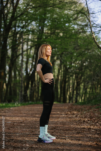 Woman exercising in a lush forest setting
